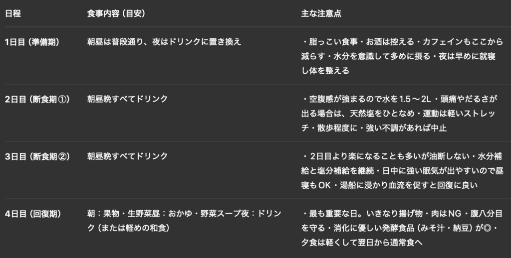 - 終了後(5日目以降):普通食に戻すが、脂っこい外食・暴食は避け、2〜3日は消化に優しい和食が安心。